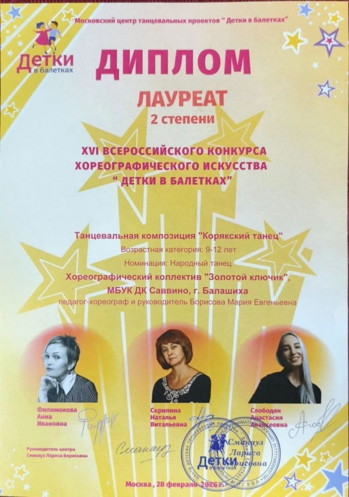 Поздравляем Даниила Х. и коллектив «Золотой ключик», занявших почетное 2-е место на престижном Всероссийском конкурсе «Детки в балетках»! Особенно приятно отметить персональную похвалу жюри за сохранение народных традиций. Так держать, ребята! |
